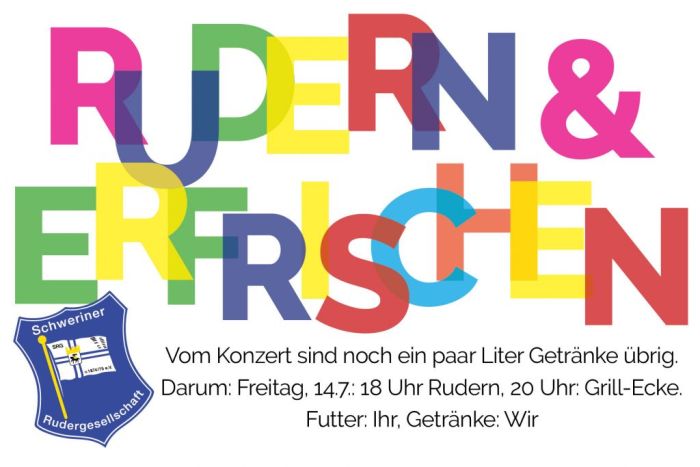 Das Fahrradkonzert am vergangenen Sonntag war toll. Auch toll: Im Bierfass ist noch was drin, und auch die eine oder andere Flasche Cola, Sekt und Wasser ist noch da. Darum treffen wir uns am Freitag, 14. Juli, 18 Uhr erst zum Rudern - um danach noch gemütlich in der Grillecke zu sitzen, um uns mit den Getränken zünftig zu erfrischen. Wir können den Grill anwerfen, was zum Drauflegen bringt aber bitte jeder selbst mit. Wer ist dabei? Jetzt schnell im Backstagebereich eintragen.